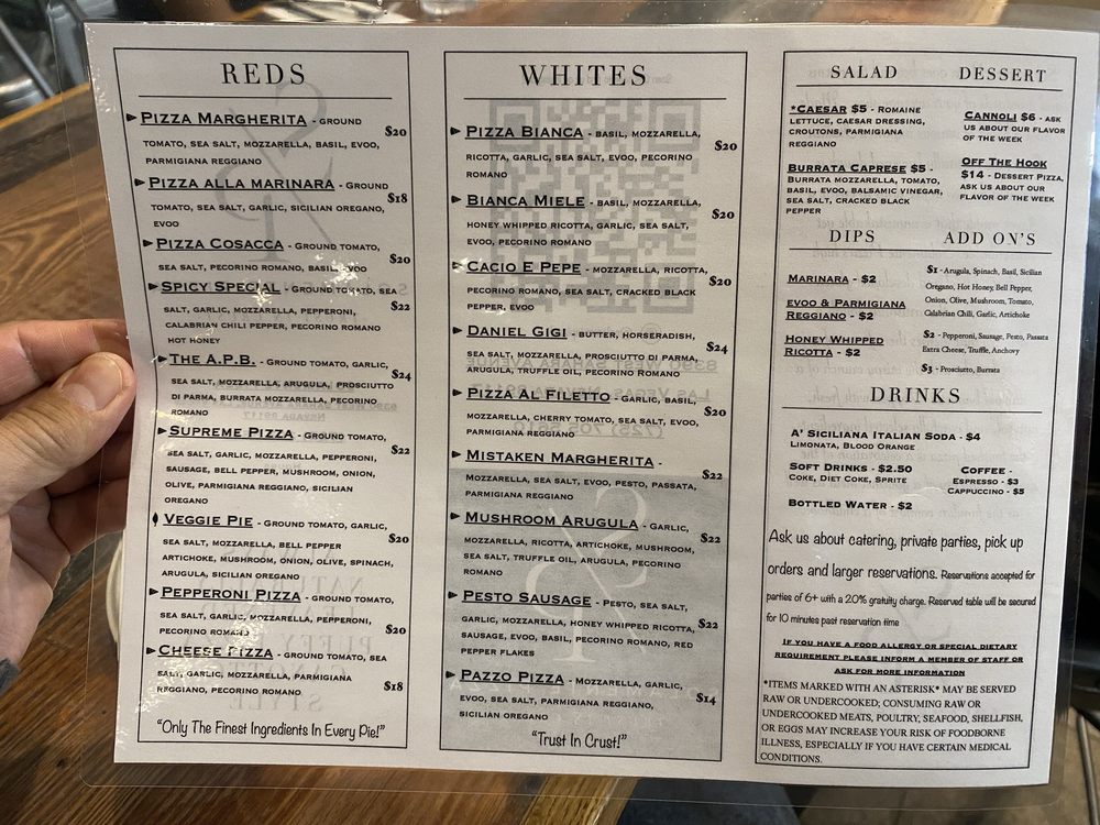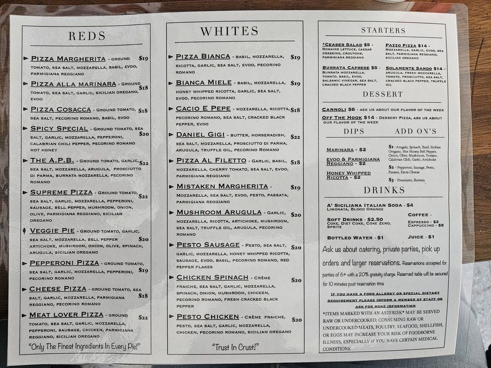 GROUND TOMATO, GARLIC, SEA SALT, MOZZARELLA, ARUGULA, PROSCIUTTO, BURATTA, PECORINO ROMANO, OLIVE OIL