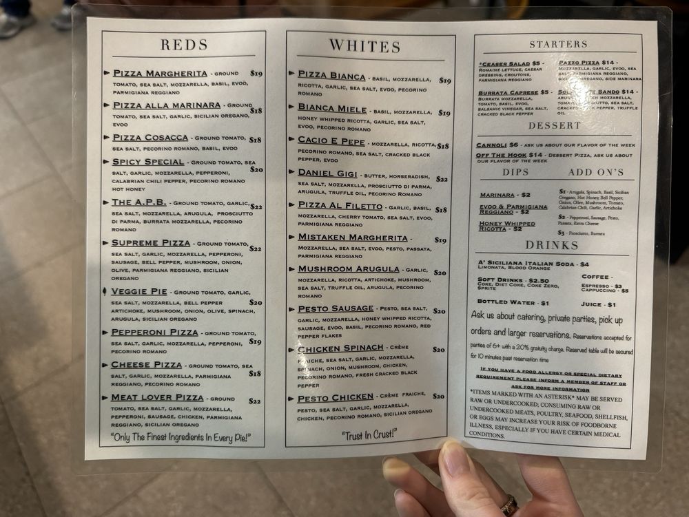 EVOO, Garlic, Mozzarella, Spinach,Onion, Olive, Bell Pepper, Mushroom,Artichoke, Tomato, Arugula, Sea Salt,Sicilian Oregano